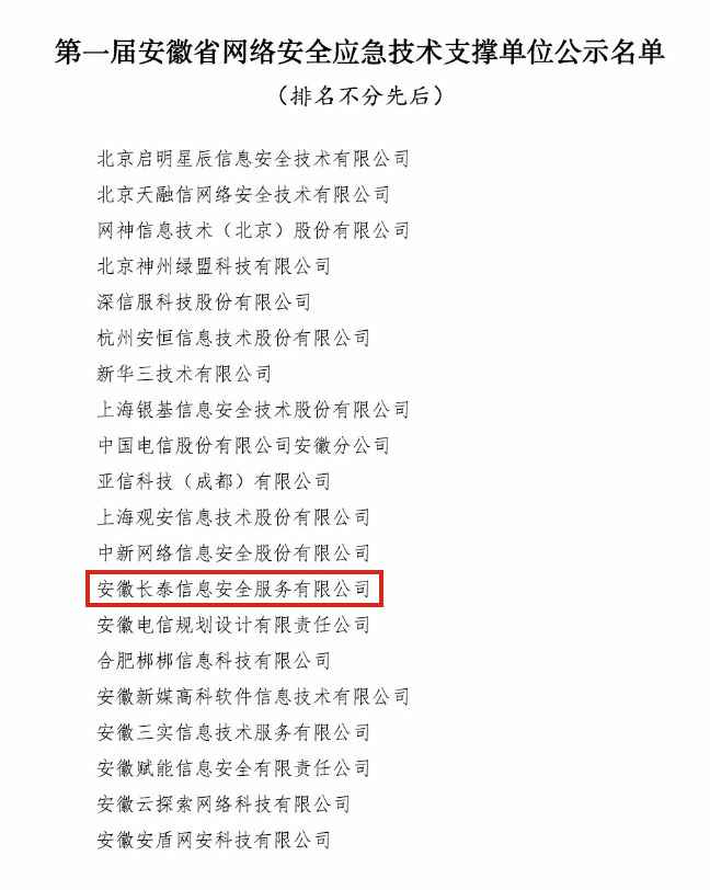 喜讯!长泰成功入选“第一届安徽省网络安全应急技术支撑单位”​