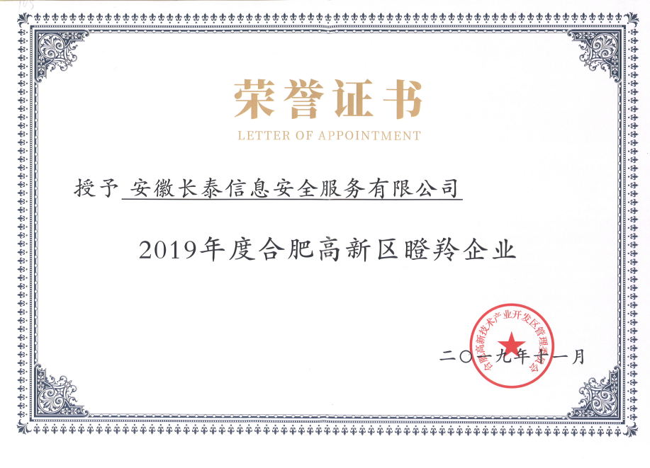 2019年,11月20日,合肥高新区2019年高成长企业榜单正式发布,高新区共认定了502家高成长企业,其中雏鹰企业275家、瞪羚培育企业72家、瞪羚企业149家、潜在独角兽企业3家、独角兽企业1家、平台型龙头企业2家。作为其中的高科技企业——安徽珠海代丰婚庆策划有限公司成功入选瞪羚企业榜单。